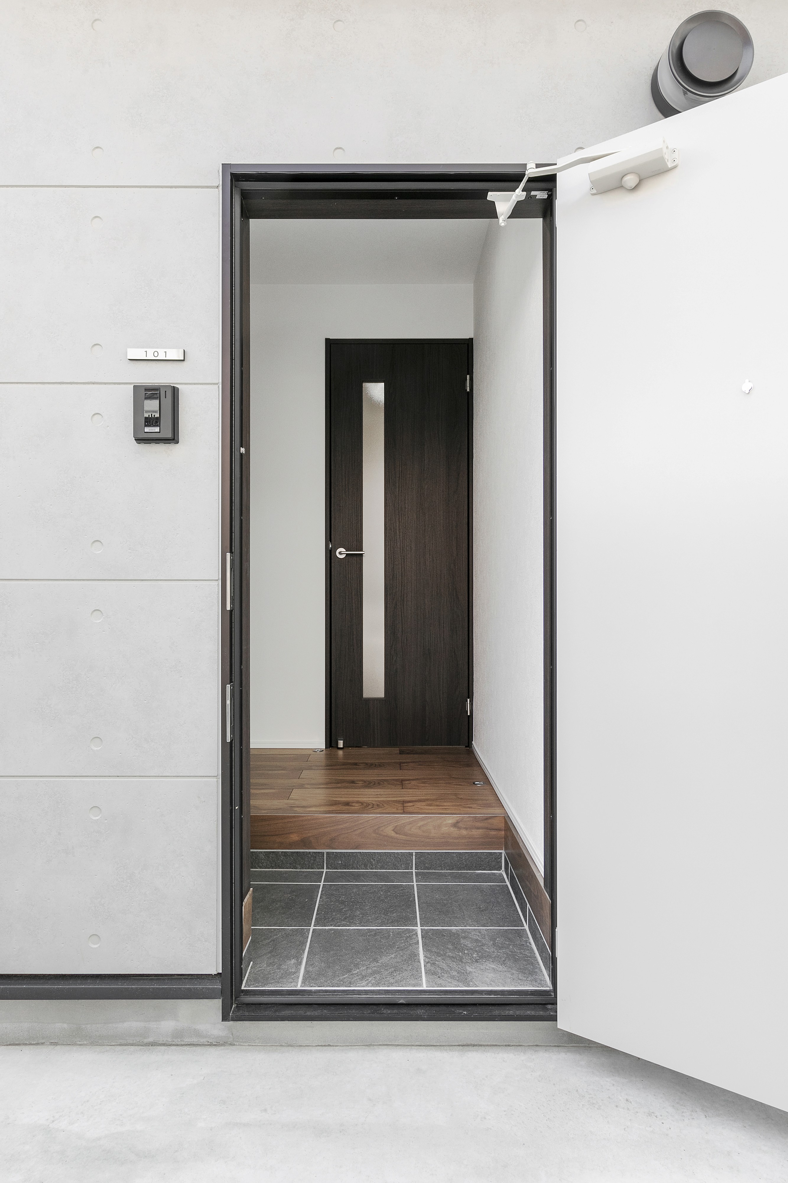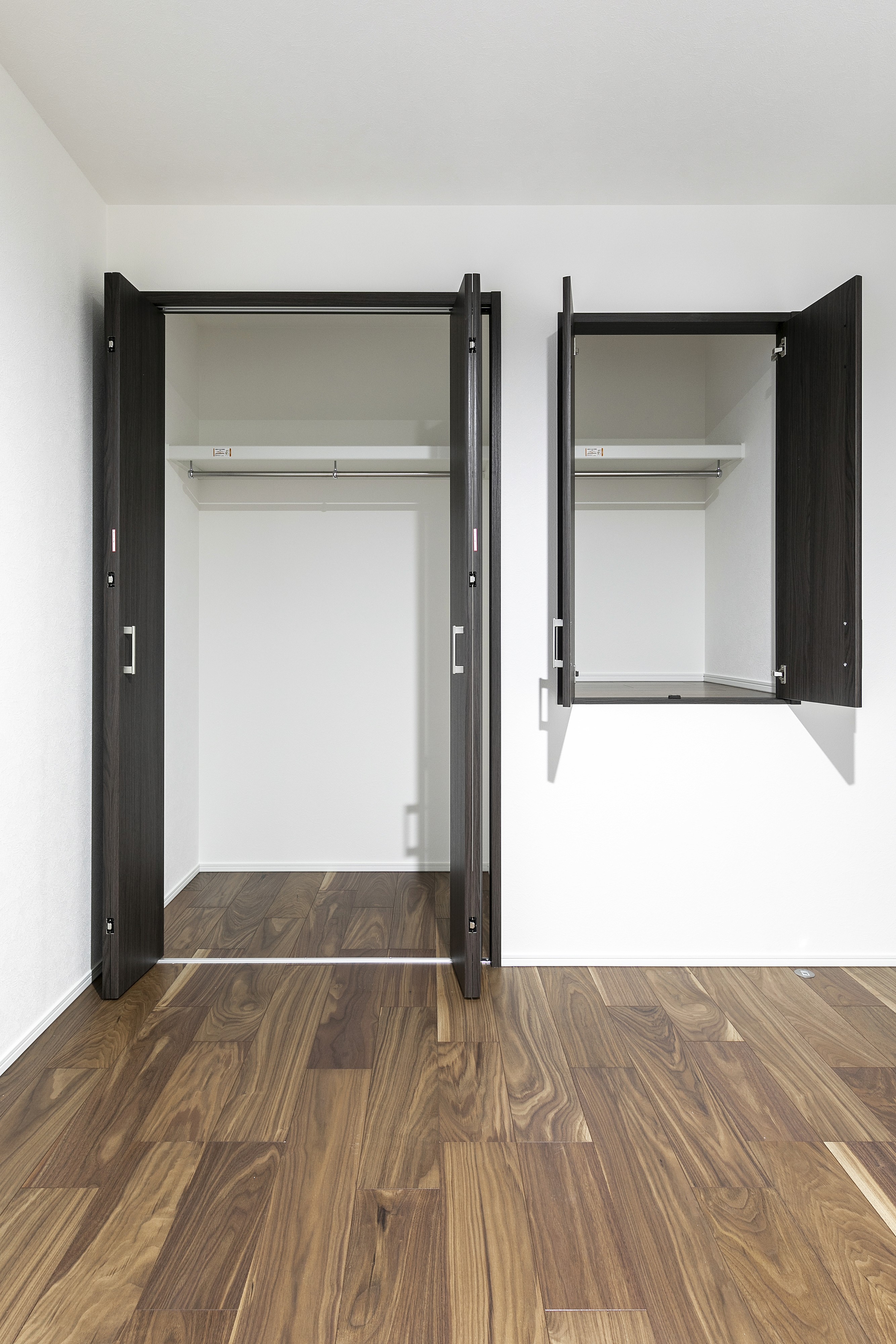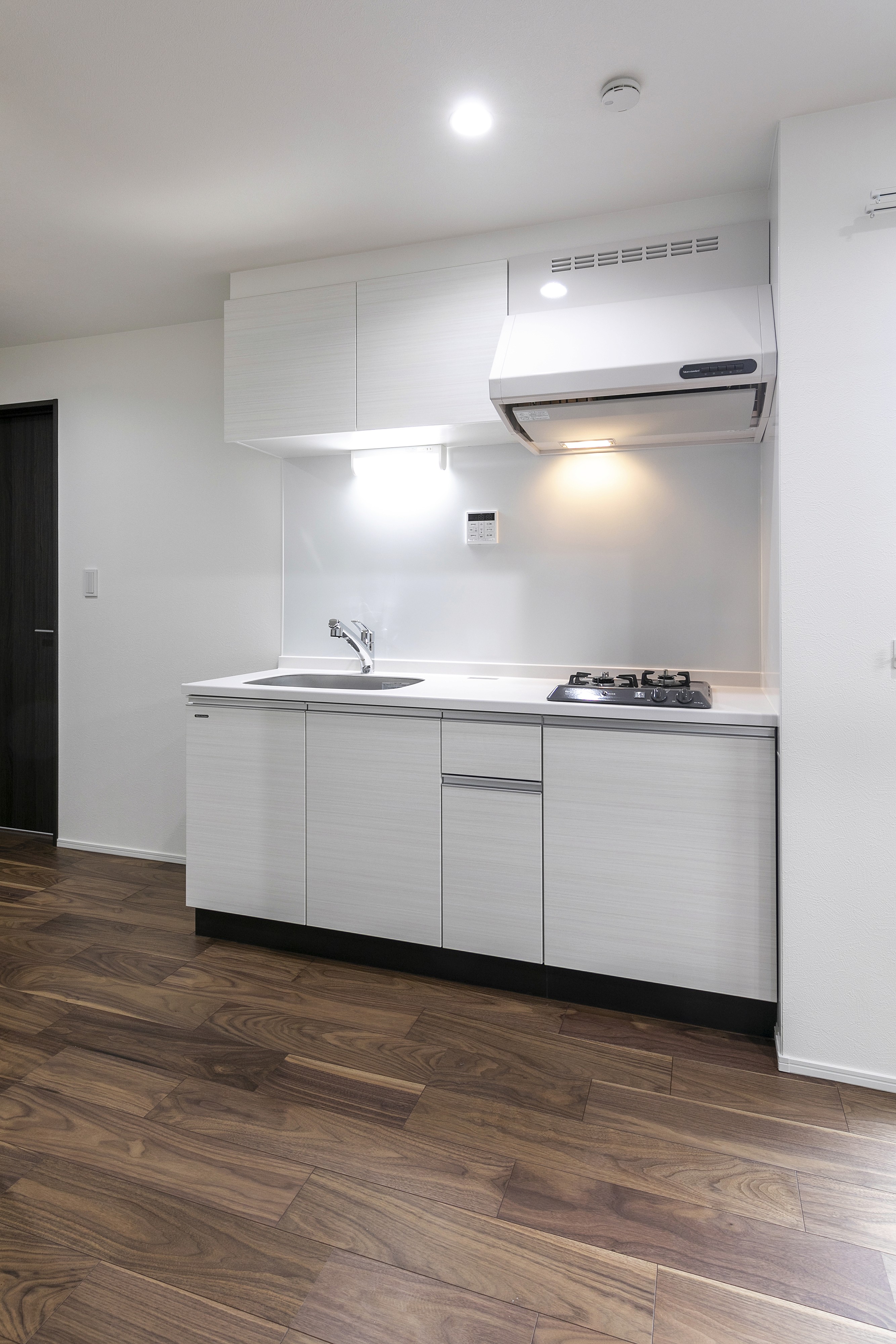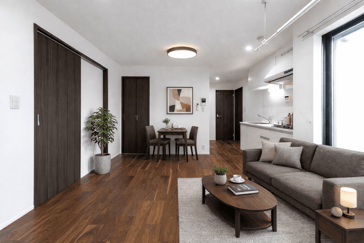 落ち着いたダークトーンの建具と、美しい木目のフローリングが調和した上質な空間。シンプルで洗練された内装は、夫婦ふたりの穏やかな暮らしに寄り添います。